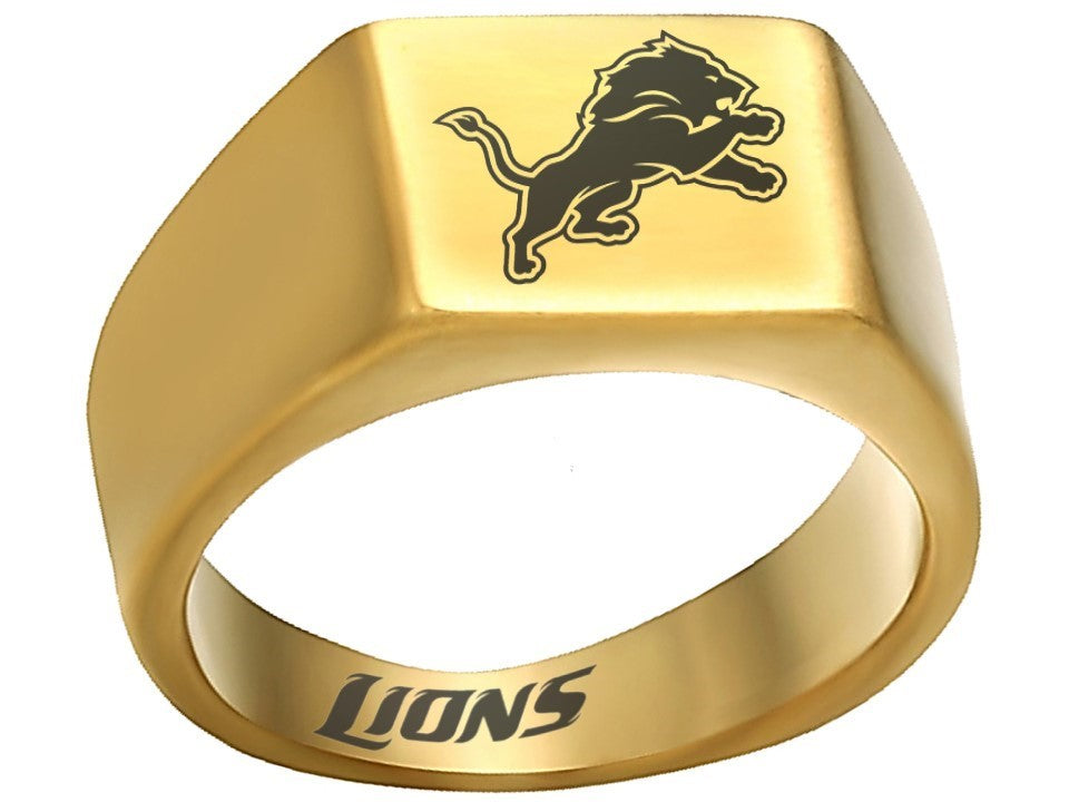 Capture the true essence of Detroit Lions fandom with our exquisite gold Detroit Lions ring. Crafted with precision and passion, this stylish ring features the iconic team logo in striking black against a sleek gold backdrop. Made of durable titanium, it symbolizes strength and everlasting commitment—a perfect representation of your love and loyalty. Personalize this ring with custom engravings, adding a touch of sentiment to commemorate your gift. Available in sizes 8-12, this exclusive titanium ring is the ultimate choice for devoted Lions fans looking to celebrate their love and team spirit in a truly unique way.