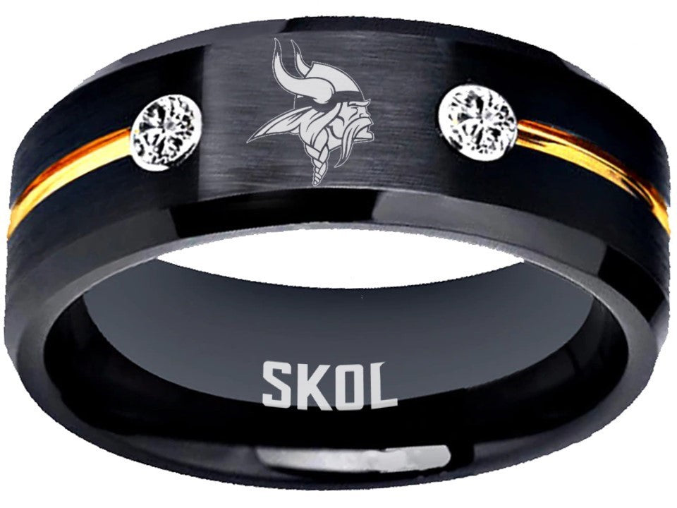 Capture the true essence of Minnesota Vikings fandom with our exquisite matte black and gold Vikings Wedding Band with 2 flawless clear stones. Crafted with precision and passion, this stylish ring features the iconic team logo in striking silver against a sleek black backdrop. Made of durable tungsten, it symbolizes strength and everlasting commitment—a perfect representation of your love and loyalty. Personalize this ring with custom engravings, adding a touch of sentiment to commemorate your special day. Available in sizes 6-13, this exclusive wedding band is the ultimate choice for devoted Vikings fans looking to celebrate their love and team spirit in a truly unique way.