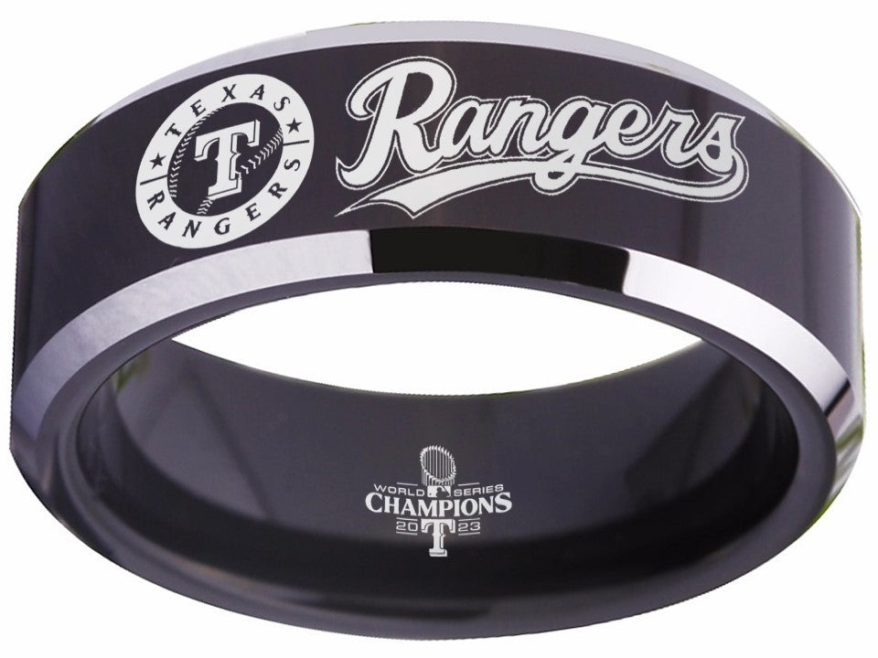 Capture the true essence of Texas Rangers fandom with our exquisite Black and Silver Texas Rangers 2023 World Series Championship ring. Crafted with precision and passion, this stylish ring features the iconic team logo in striking silver against a sleek black backdrop. Made of durable tungsten, it symbolizes strength and everlasting commitment—a perfect representation of your love and loyalty. Personalize this ring with custom engravings, adding a touch of sentiment to commemorate your special day. Available in sizes 4 - 17, this exclusive wedding band is the ultimate choice for devoted Rangers fans looking to celebrate their love and team spirit in a truly unique way.
