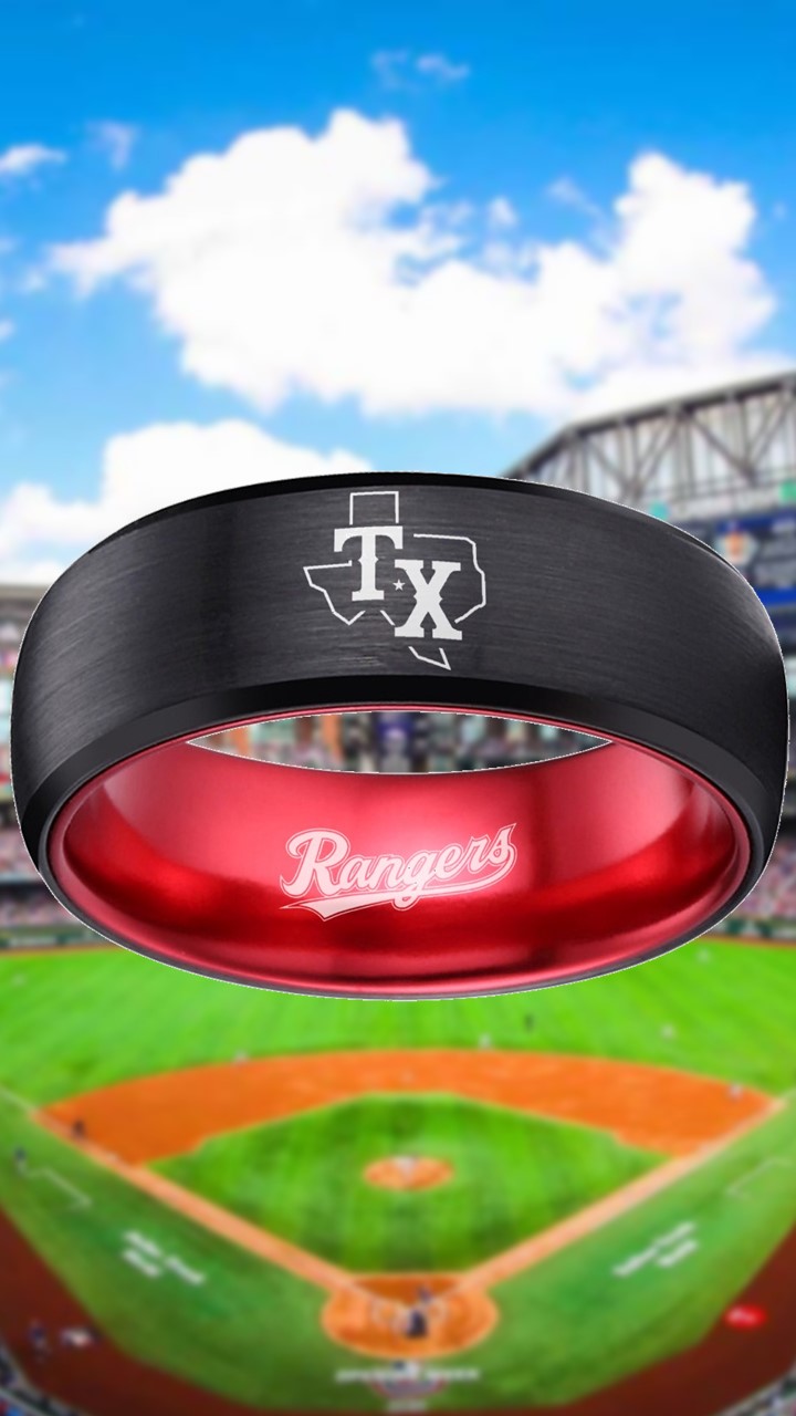 Capture the true essence of Texas Rangers fandom with our exquisite black and red Texas Rangers ring. Crafted with precision and passion, this stylish ring features the iconic team logo in striking silver against a sleek black backdrop. Made of durable tungsten, it symbolizes strength and everlasting commitment—a perfect representation of your love and loyalty. Personalize this ring with custom engravings, adding a touch of sentiment to commemorate your special day. Available in sizes 6-13, this exclusive wedding band is the ultimate choice for devoted Rangers fans looking to celebrate their love and team spirit in a truly unique way.